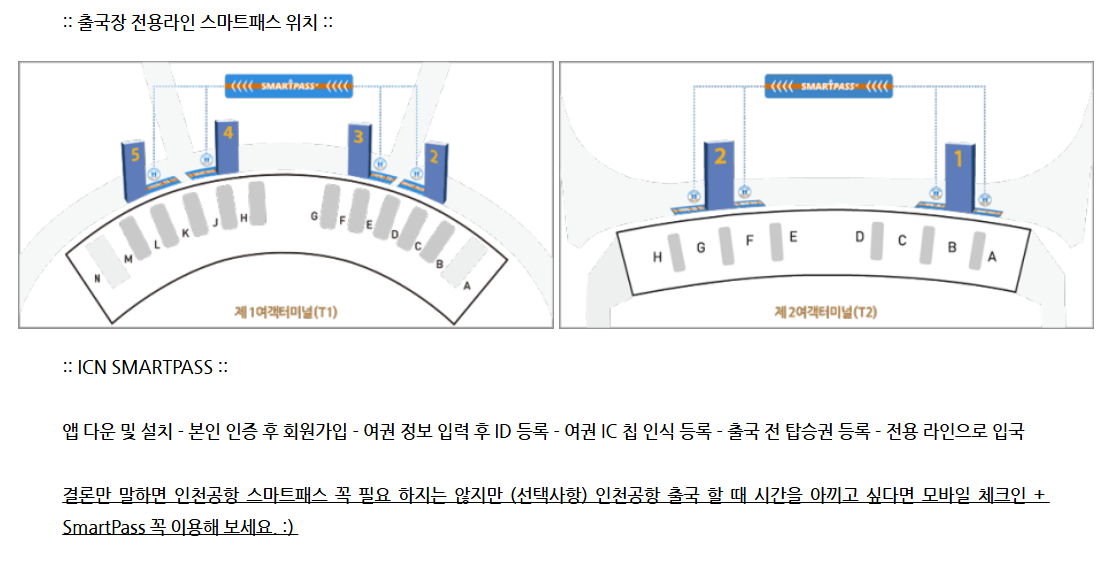 인천공항을 자주 이용하는 여행자이시면, 스마트패스 서비스를 잘 활용해 보시면 매우 유용합니다. 스마트패스는 출국 전 보안 검색대와 출국심사를 빠르게 통과할 수 있는 아주 편리한 서비스입니다. 여권과 바이오정보를 사용하여 등록가능합니다. 출국시간 대기시간을 확 줄여주는 매우 활용 중요한 공항서비스입니다.
