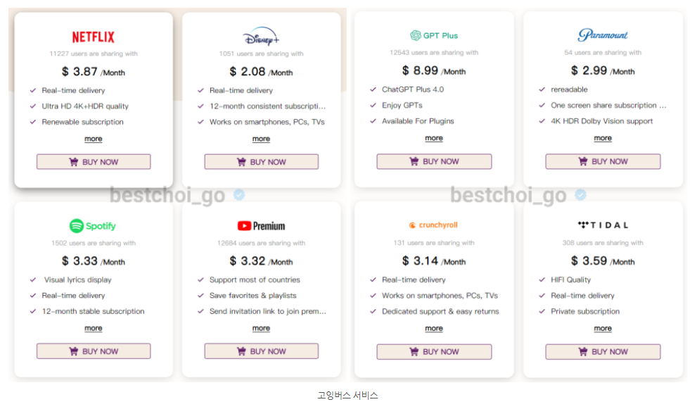 고잉버스는 유튜브프리미엄이나 넷플릭스 디즈니플러스 같은 영상기반플랫폼과 스포티파이 같은 서비스부터 GPT 플러스와 같은 인공지능 프리미엄 서비스의 비용을 절약해 주는 서비스입니다. 예를 들면, 24년 5월 기준 유튜브는 3.32달러 넷플릭스는 3.87달러 정도로 저렴합니다. 고잉버스(GoingBus)는 사용자들이 OTT 등 다양한 구독플랫폼을 좀 더 저렴한 가격에 이용할 수 있도록 도와주는 구독형 서비스입니다. 평소에 많이들 이용하시는 유튜브프리미엄, 넷플릭스, 쳇 GPT 등의 서비스를 무려 80%까지 할인된 가격으로 구독할 수 있습니다.
