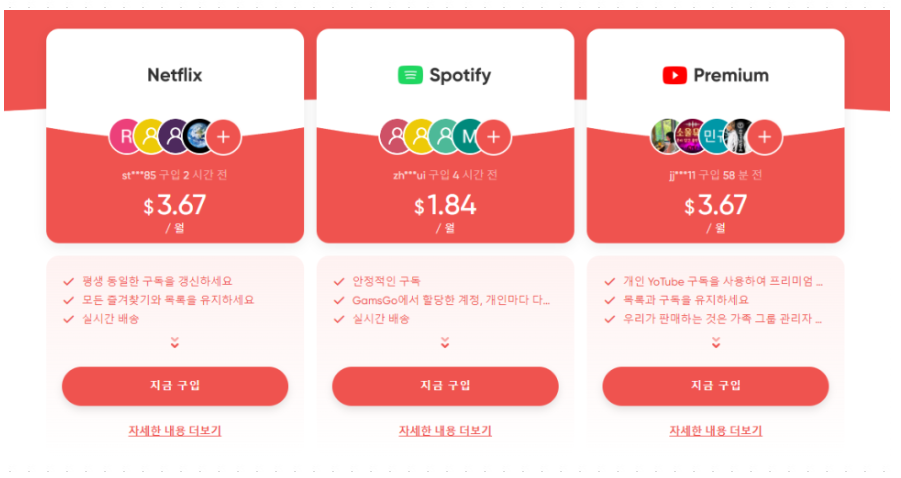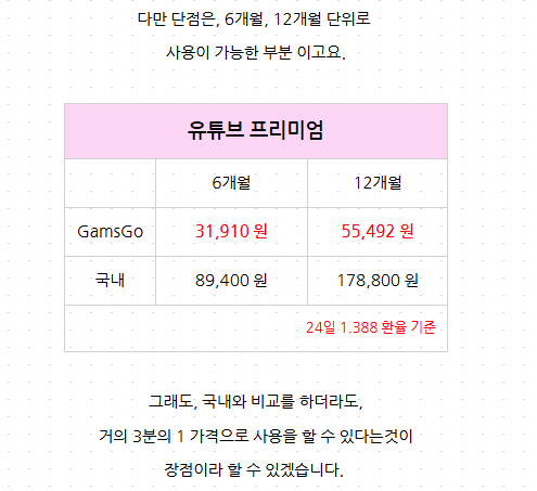 이번에는 유튜브 프리미엄 가족 공유 방법을 알려드리려고 합니다. 원래 우리나라에서는 가족공유가 안되는데, OTT 공유 사이트인 겜스고를 통해서라면 가능하다고 합니다. 정말 저렴하게도 한 달에 $3.75(약 5000원)으로 유튜브 프리미엄을 이용할 수 있다고 합니다. 겜스고 아직 이용을 안 해 보신 분이라면 이번기회에 한번 시작해 보시라고 추천드립니다. 디즈니플러스랑 넷플릭스도 이와 같이 저렴하게 이용하실 수 있다고 합니다.