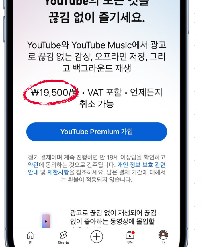 유튜브 프리미엄 가격의 경우에 주의할 점이 있습니다. 기본적으로 14,900원이지만 , 아이폰에서 구독으로 보면 19,500원으로 보이게 된다는 것입니다. 이는 애플 구독의 경우 수수료가 포함되어 안드로이드 보다 비싸게 측정이 되어서