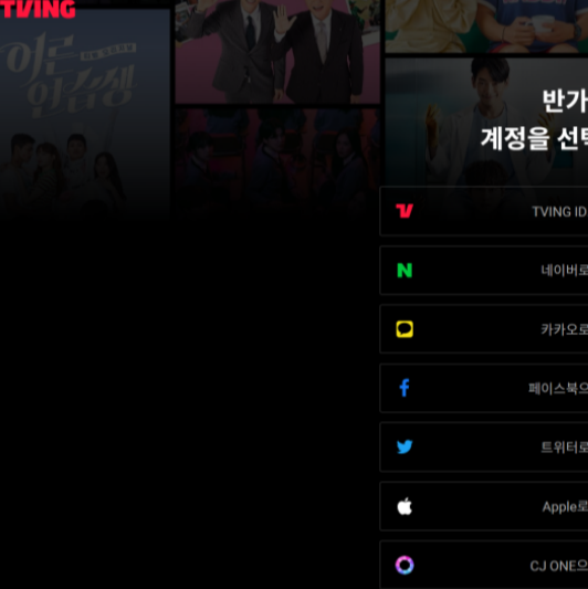 3. 네이버, 카카오, 페이스북, 트위터, 애플, CJ 계정 중 편한 것을 선택하여 간편하게 가입하실 수 있습니다. 이전에는 유료 구독자만 이용 가능했던 실시간 TV를 이제 간단한 가입절차를 통해 무료로 시청하실 수 있습니다.