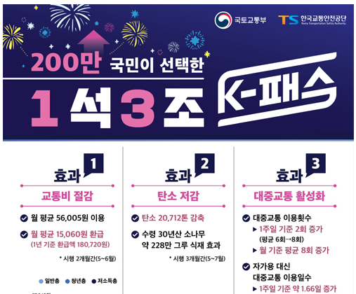 국토교통부에서 2023년 8월 29일 대중교통비 환급 지원사업을 발표했습니다. 이 사업은 월 15회 이상 대중교통을 이용하는 경우, 사용액의 일부를 적립해 환급해 주며, 알뜰교통카드를 대체하는 후속 사업으로 2024년 5월 1일부터 시작되었다.