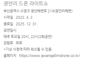 부산 광안리해수욕장에서 매주 토요일 저녁 2회 진행합니다. 동절기와 하절기의 1시간 차이가 있습니다.