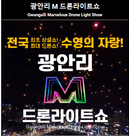 광안리드론쇼는 매주 토요일 저녁, 광안리의 밤하늘을 새롭고 다채로운 콘텐츠로 아름답게 수놓는 <광안리 M 드론 라이트쇼>는 'Marvelous'라는 단어에서 가져온 '놀라운, 경이로운'의 의미를 담고 있습니다. 이 드론쇼는 광안대교의 야경과 조화를 이루며, 광안리를 방문하는 이들에게 경이로움과 신비함을 선사할 것입니다.