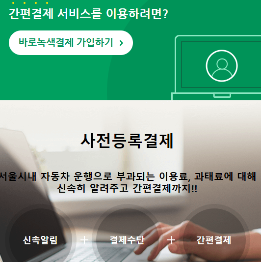'바로녹색결제'는 서울특별시 홈페이지 (http://oksing.seoul.go.kr)에서 회원가입 차량 미리등록등을 통해 정산기